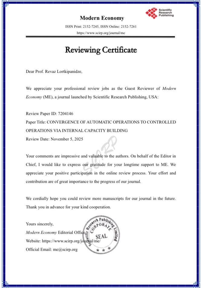 In addition, the journal Modern Economy has given a high appraisal to Revaz Lortkipanidze’s review on the current topic “The Correlation Between Self-Regulation and Regulatory Factors.”
